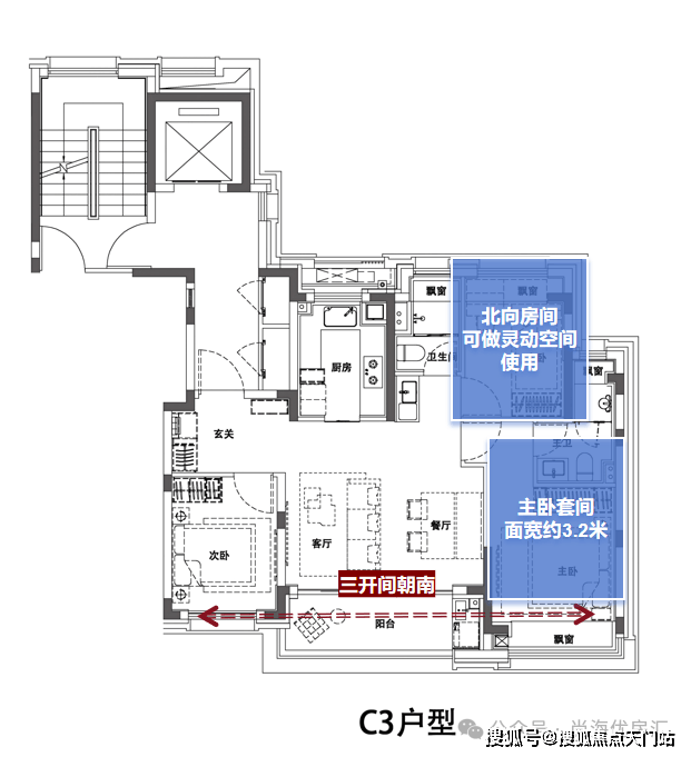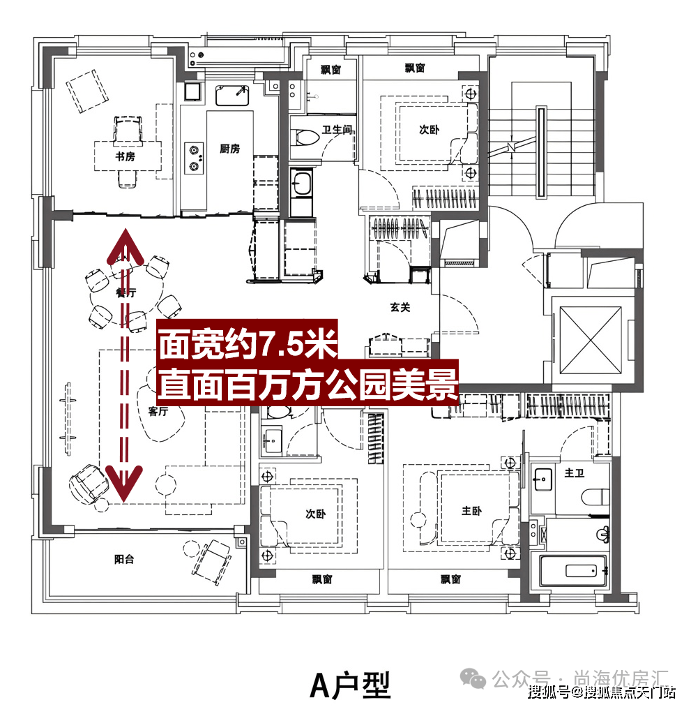 270度景不雅大横厅:户型最大的亮点是面宽约7.5米、进深约5米的客餐厅一体化空间,共同西侧长达约4.5米的巨型景不雅窗,凹地,